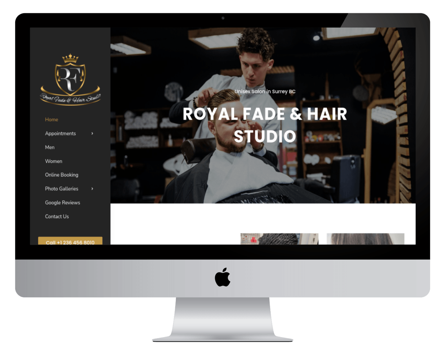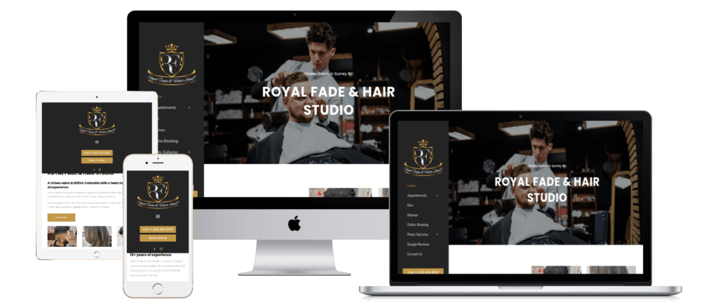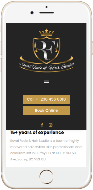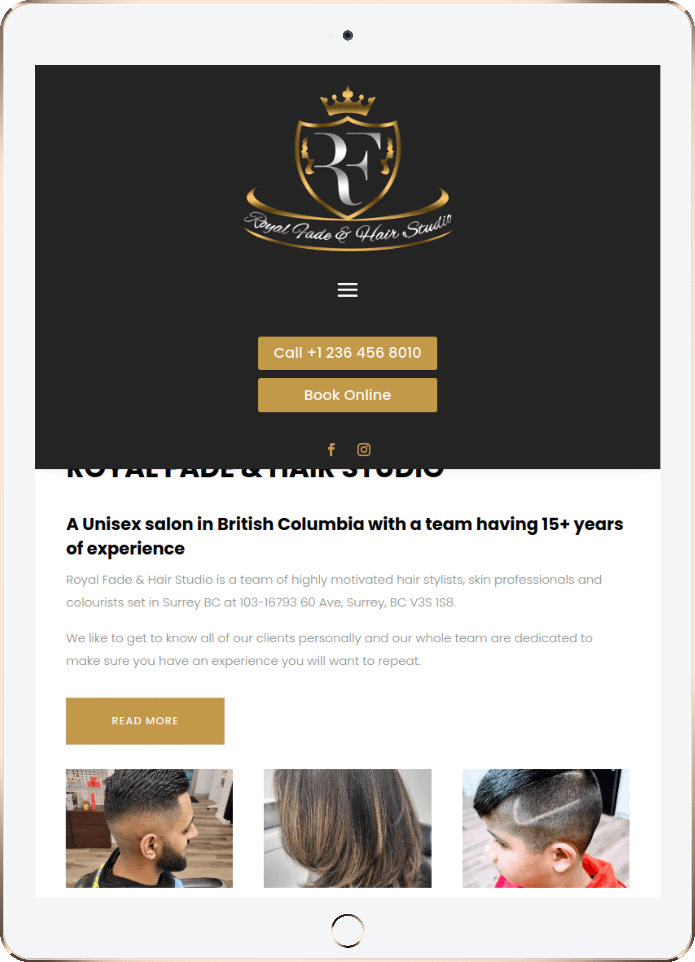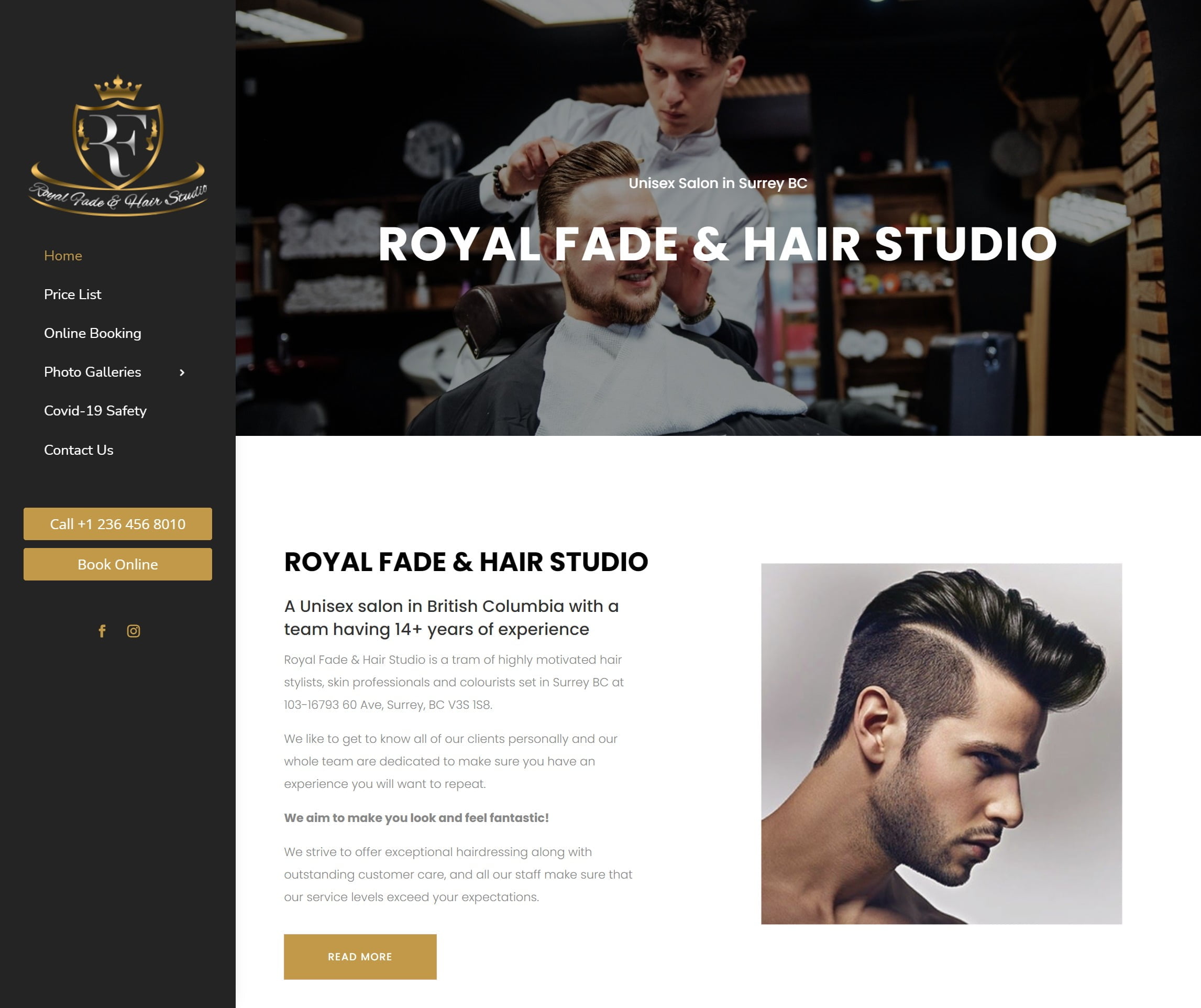 Website and Graphic designing services for Royal Fade Hair Studio located at 103-16793 60 Ave, Surrey, BC V3S 1S8. Business / Website type: Beauty and Hair,Salon