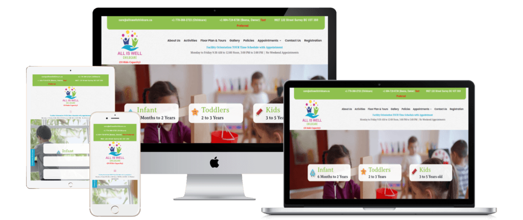 All Is Well Childcare is a fully licensed group childcare facility located in Surrey, British Columbia, established in 1971. It offers both full-time and part-time programs tailored for infants, toddlers, and children aged 3 to 5 years. The facility is dedicated to providing a safe and stimulating learning environment, where children can thrive and develop through play-based learning. Target keywords for the website include “childcare,” “infant care,” “toddler programs,” and “preschool education.” The focus on nurturing and educational activities makes it an ideal choice for parents seeking quality childcare services in their community.