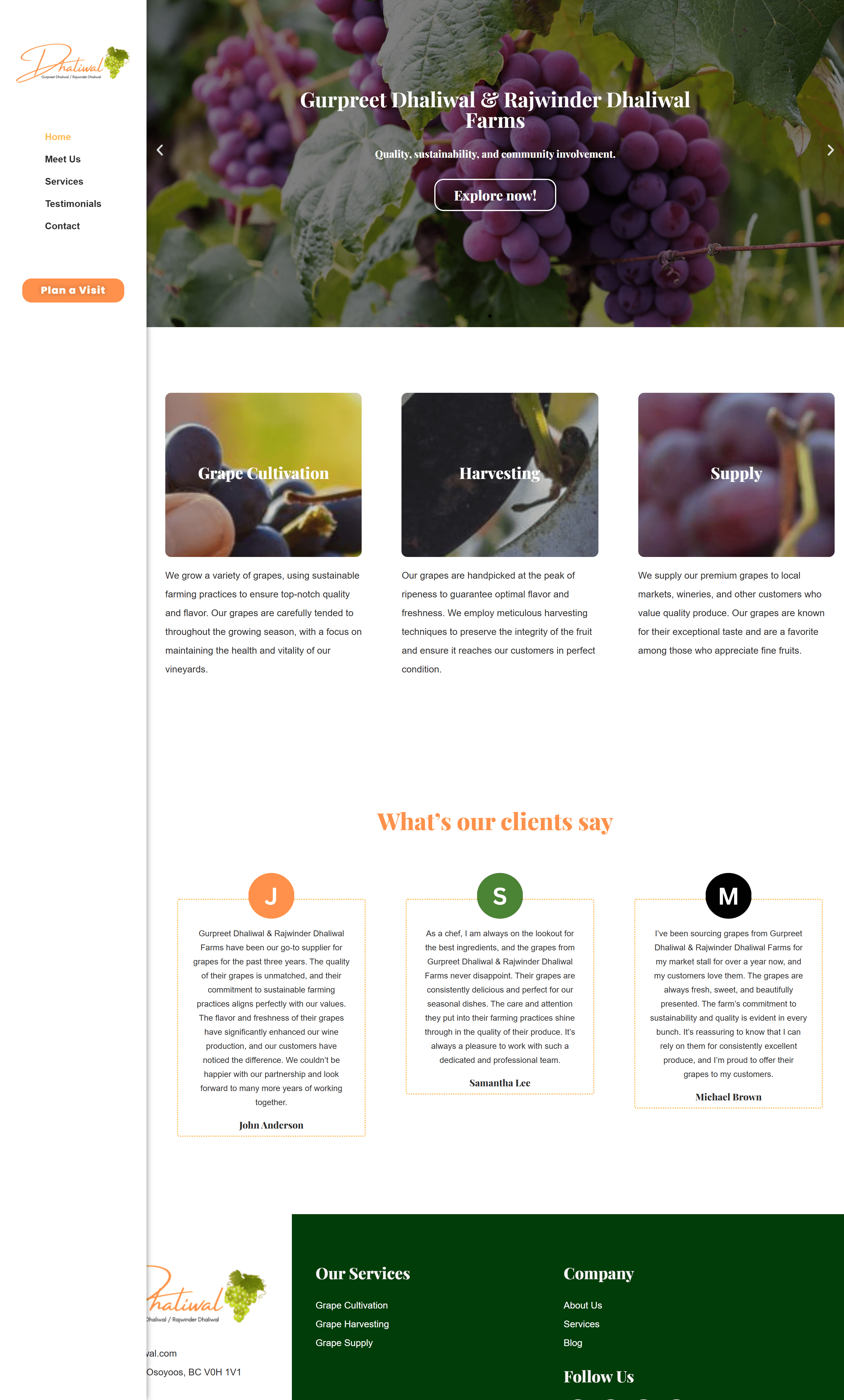 Gurpreet Dhaliwal & Rajwinder Dhaliwal Farms is a reputable business based in Osoyoos, British Columbia, specializing in grape cultivation. The farm is dedicated to sustainable farming practices, ensuring that a variety of high-quality grapes are produced for the market. In addition to grapes, they offer fresh produce sales, catering to customers who value quality and sustainability. With a strong commitment to excellence, they have established themselves as a trusted name in the local agricultural community. Target keywords include grape cultivation, sustainable farming, fresh produce, and Osoyoos agriculture, highlighting their focus on quality and environmental responsibility.
