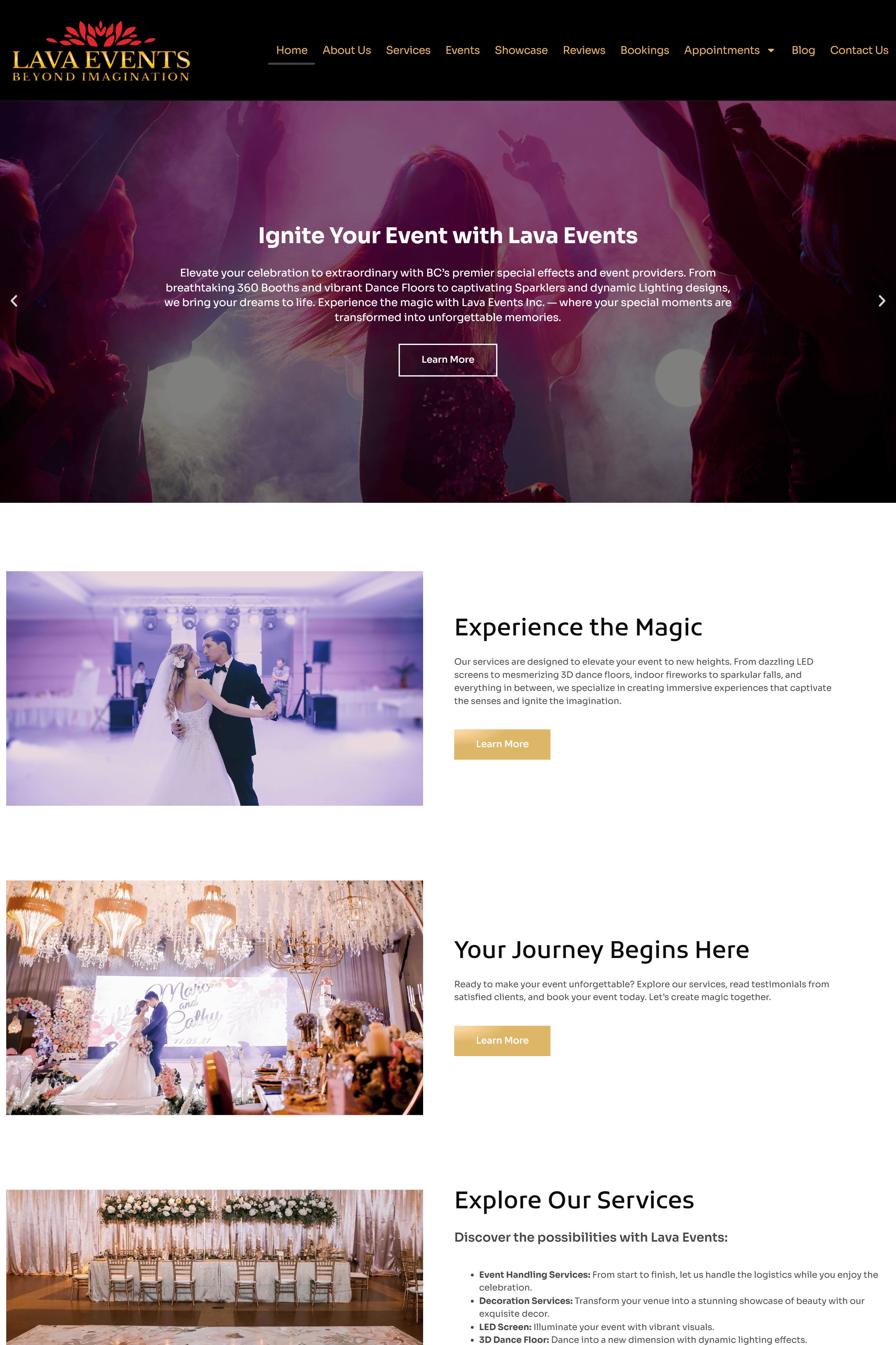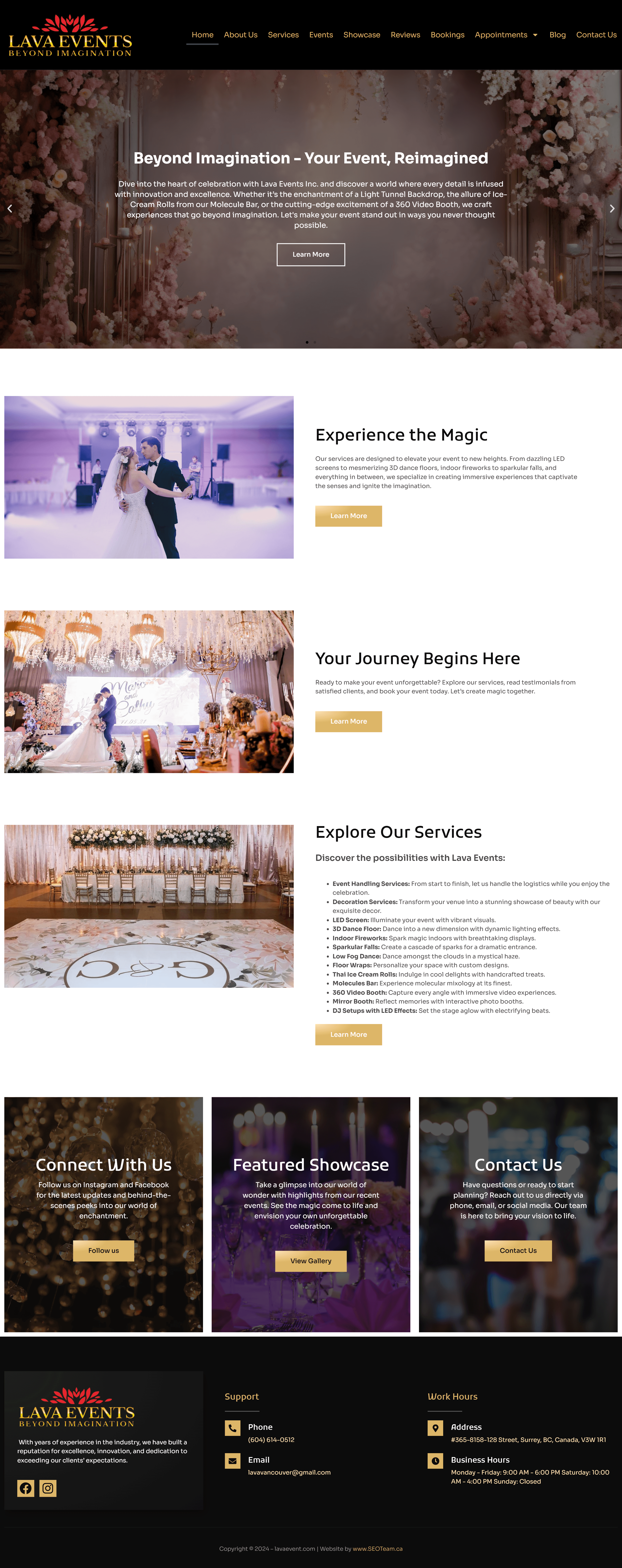 Lava Events Inc. operates under the website title “Beyond Imagination – Your Event, Reimagined,” specializing in the event planning and entertainment category. The company focuses on enhancing celebrations through innovative services such as 360 Booths, vibrant Dance Floors, captivating Sparklers, and dynamic Lighting designs. With a commitment to transforming special moments into unforgettable memories, Lava Events Inc. aims to provide a unique experience for its clients. Target keywords for the business include event planning, celebration enhancement, and innovative entertainment services, highlighting their dedication to elevating events with creativity and professionalism.